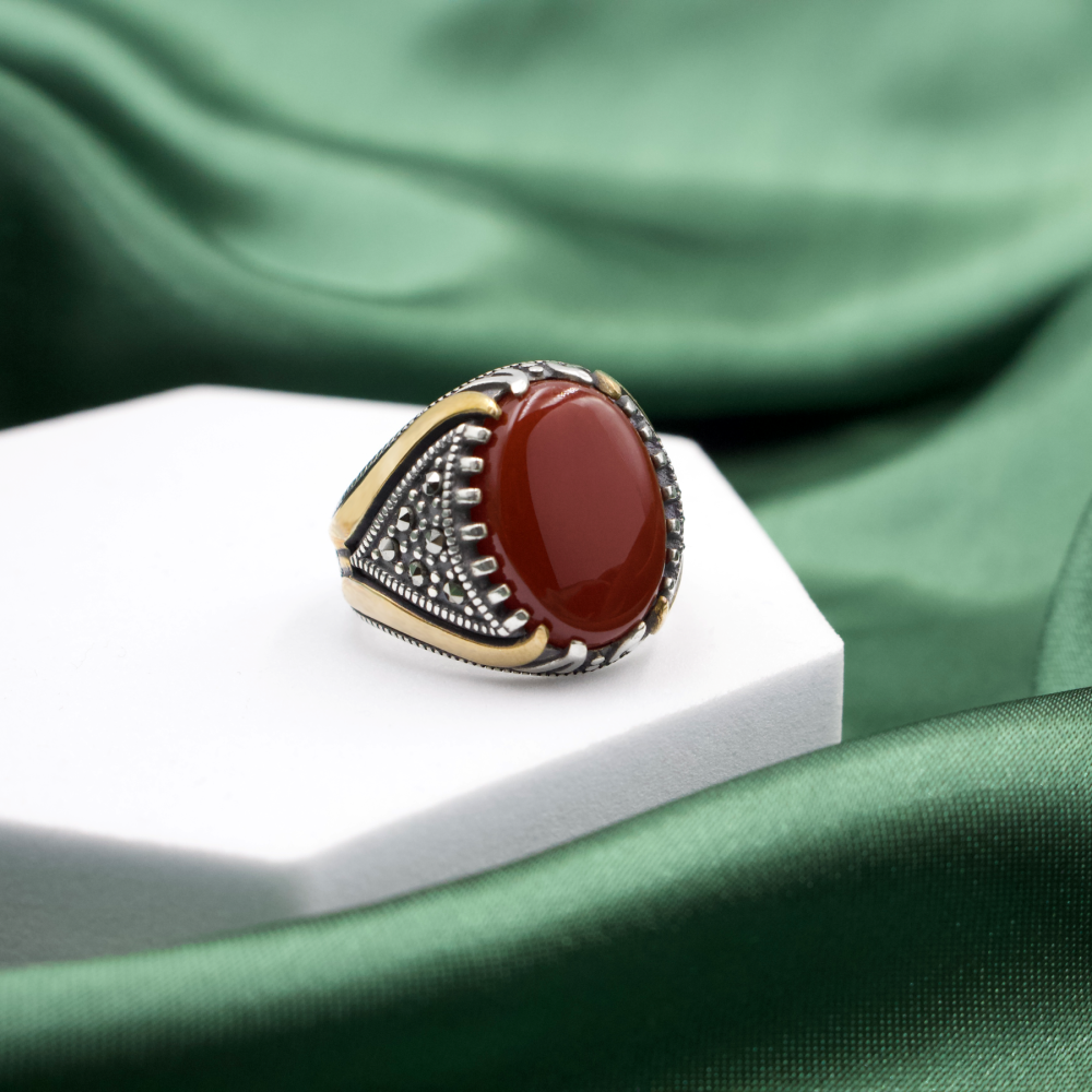 خاتم فضة أصيل عيار 925 يتألق بحجر عقيق برازيلي أحمر كبير الحجم، يمنحك حضورًا لافتًا وأناقة تخطف الأنظار بفضل تصميمه المميز وتفاصيله الفاخرة
